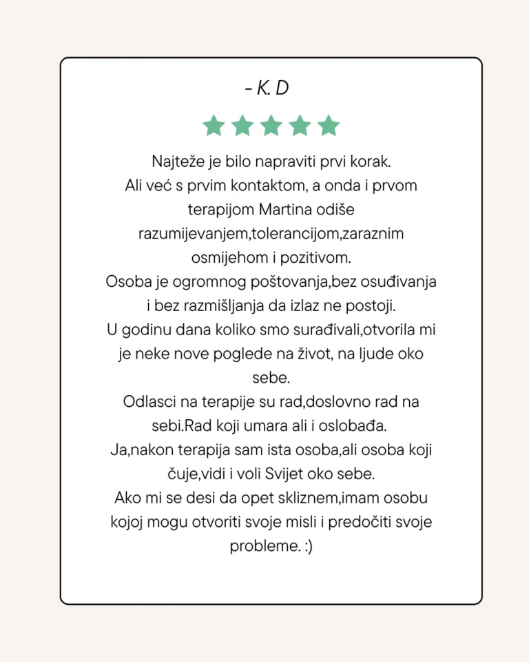 Psihoterapija nije nužno mjesto gdje dolazimo kada imamo neki veliki problem, to je mjesto gdje dolazimo da očuvamo mentalno zdravlje, da rastemo, sazrijevamo, osvještavamo, opraštamo sebi i drugima te učimo voljeti svaki naš dio.